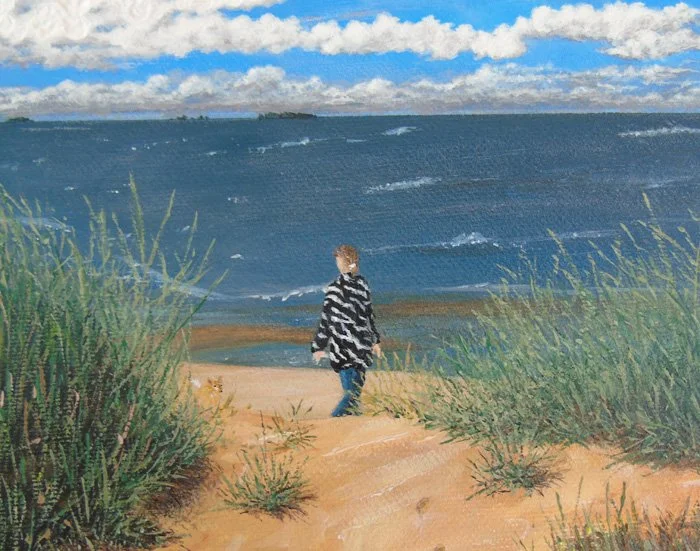 There’s my niece Anni with her dog Sani, running somewhere outside the photo. Anni was wearing an eye-catching coat. The black and white pattern turned out to mirror the painted sky and I wanted that to stand out in detail. The grass in detail took time to create, so much so that I left the foreground white and we can imagine the winter out there. But then the clouds caused trouble, they were not dramatic enough. So, I decided to thicken the clouds layer by layer, for more depth in the scenery. Think it turned out alright in the end… I've been at Hakunti-beach in all seasons, that’s why the surreal feel, as the light and colors came out from my memories.