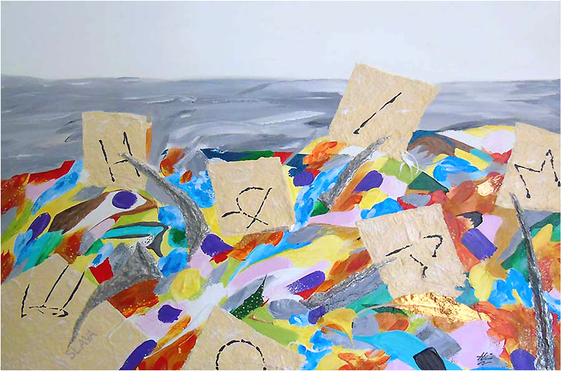 "Heroiam Slava"; Ukrainian: Героям слава! -"Glory to the heroes!". Started this while president Putin was gathering his army by the Ukrainian borders. Made first the squares and bayonet alike forms by smearing paper maché paste on the canvas. A chaotic image of a demonstration, was the first idea. While my paper maché mix was drying, the soldiers crossed the Ukrainian borders. Along the work the Ukrainian colors appeared. Symbolic details, fields and shores, against a gray background; the world beyond a nation in distress.