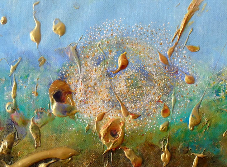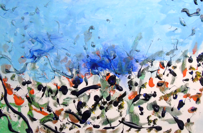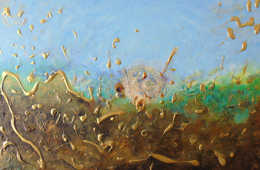 This was the “spark”. Unwanted marine blue paint straight from the tube here and there around an empty canvas. After a week or so, more leftover paints appeared and an idea of an explosion was growing. “Don’t waste paint”, my grandmother kept telling me. This might be the reason why, or she wanted me to do some real work.